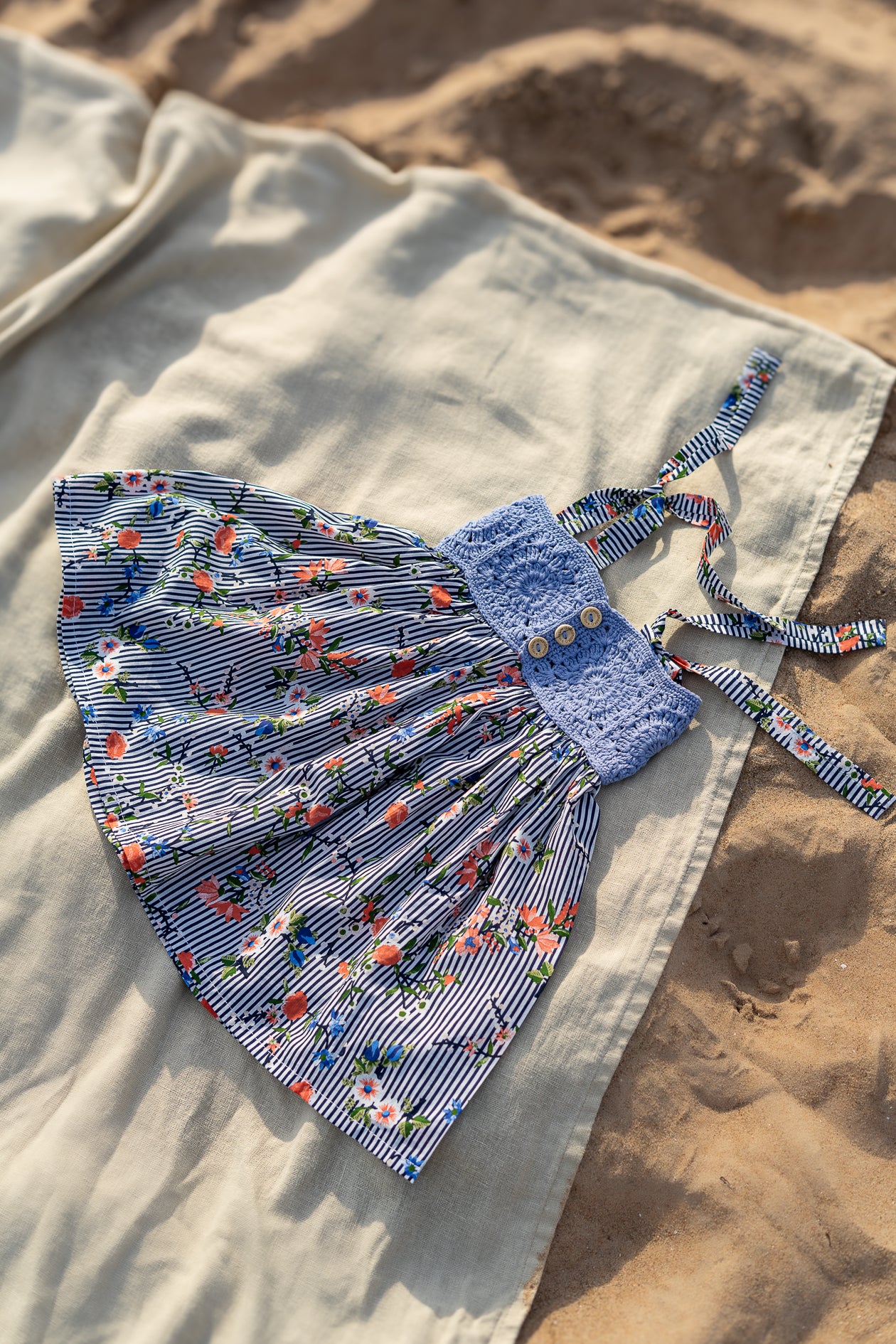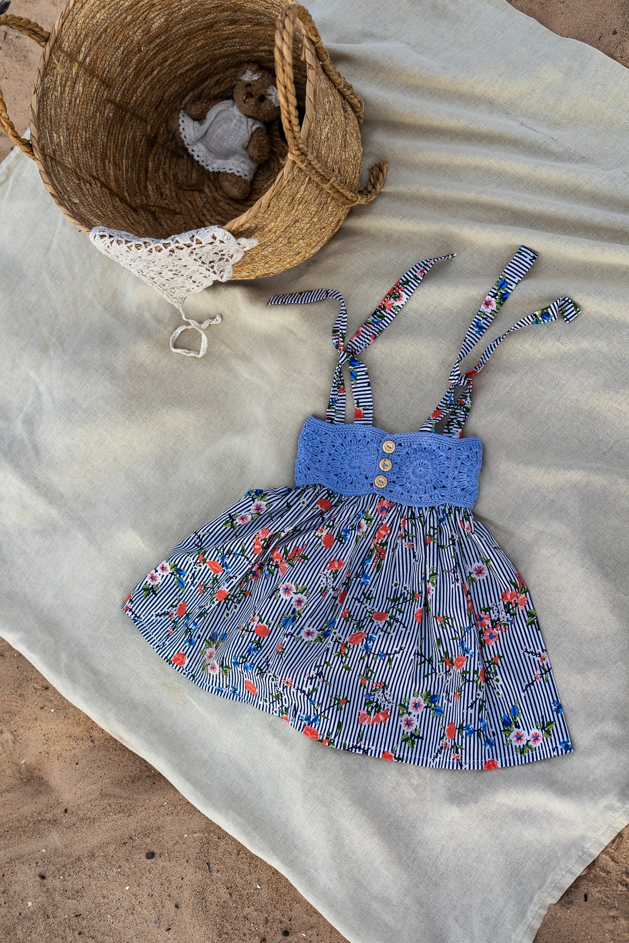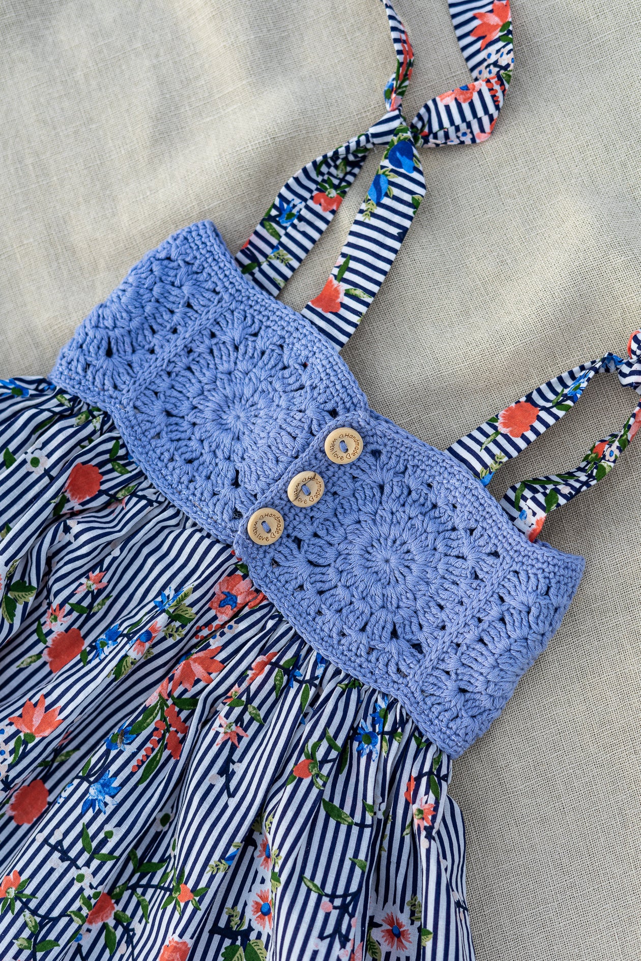 Šī kleitiņa radīta tieši tādām dienām, viegla, elpojoša, ar tamborētu augšdaļu, koka podziņām un brīvu, kustībai ērtu siluetu. Roku darbs tikai vienā eksemplārā.
