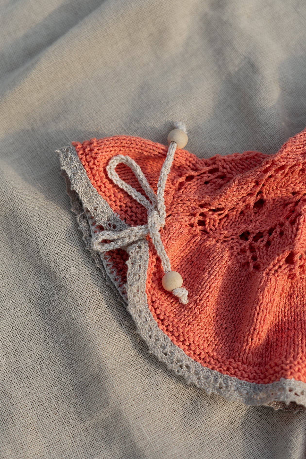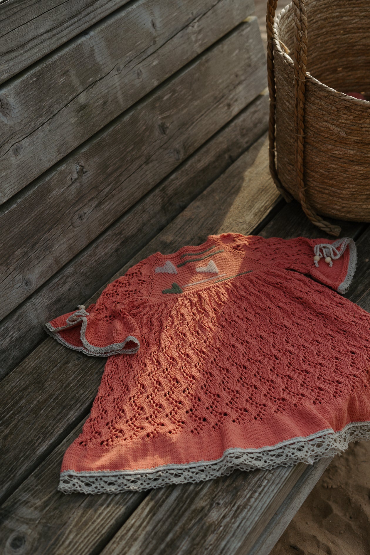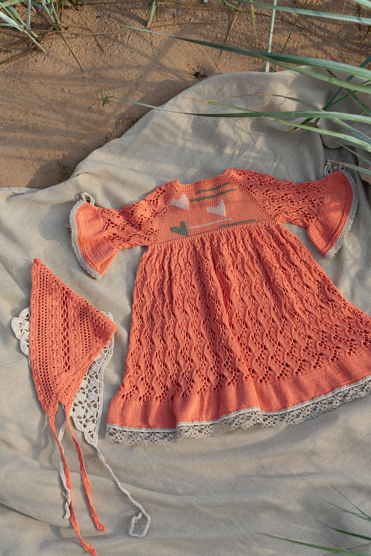 Šī bērnu kleita, adīta mežģīņu rakstā ar tamborētām maliņām un izšūtām sirsniņām, darināta no 100% kokvilnas dzijas. Viegla un elpojoša, tā ir piemērota gan rotaļām smiltīs un pļavās, gan ciemošanās reizēm, kad gribas sajusties īpaši un nepiespiesti.