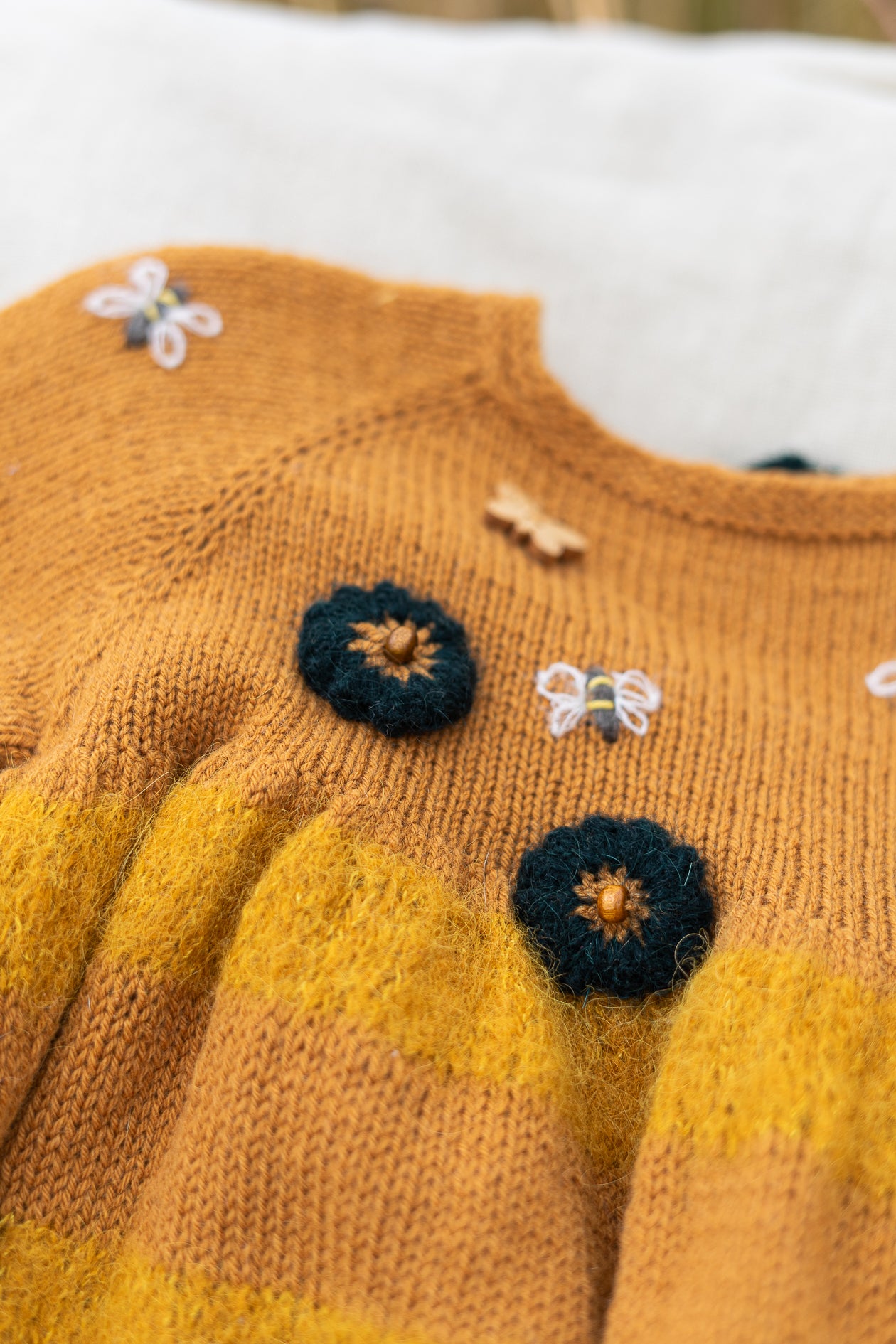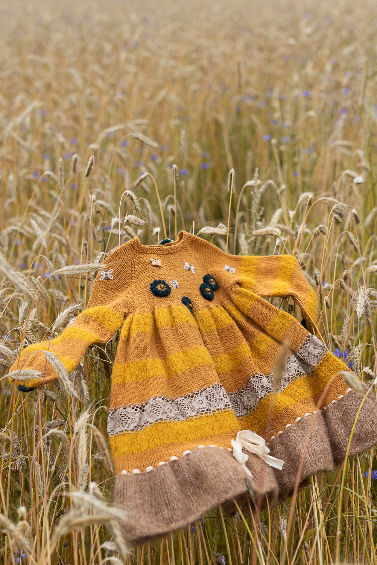 Adīta bērnu kleita siltos medus toņos, iedvesmojoties no medus bitēm vasaras ziedos.