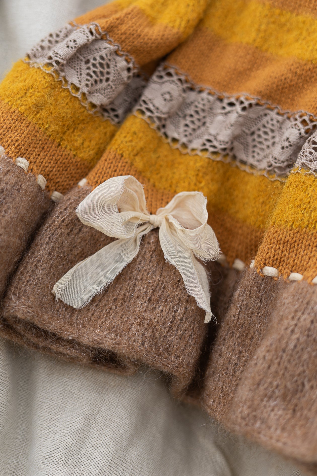 Sastāvā dzija no 85% merino vilnas un 15% kašmira, 77% alpakas vilna un 23% zīds. Mežģīne no 100% kokvilnas un dekoratīvas bantītes no zīda ar kokvilnu.